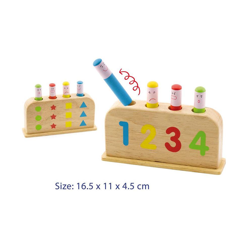 Learn colours, numbers, shapes and emotions with the cute pop up people. Further to those, you will also help your child learn about action and reaction and cause and effect. Push them down and watch the people bounce back out. Great for fine motor skills, hand eye co-ordination and simply having a good time.