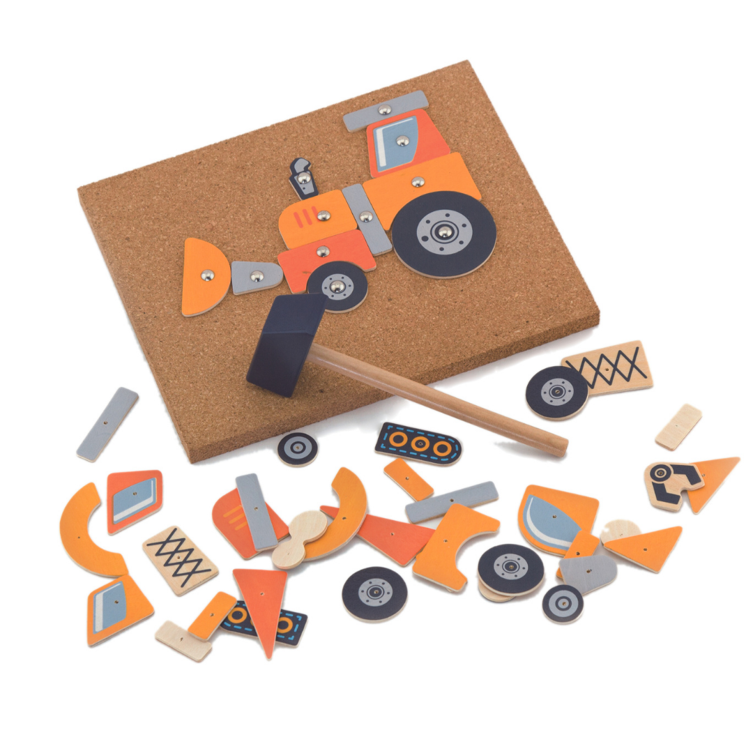 Includes cards to copy, or make your own designs! Set has 45 wooden pieces, 1 cork board, 1 hammer and a box of tacks and 5 double sided cards to copy the 10 pictures.